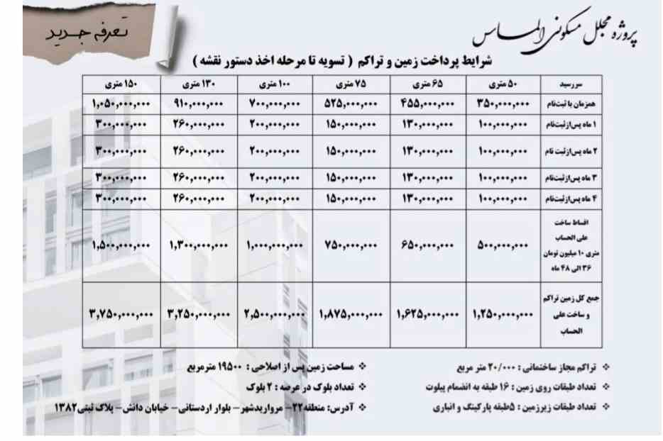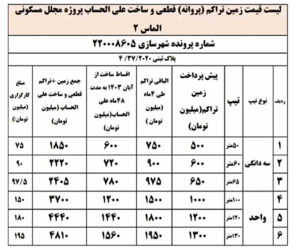 به همین دلیل است که توجه داشته باشید این قیمت ساخت اعلام شده قطعی نیست و قیمت تمام شده که در جدول زیر توسط تعاونی منتشر شده است واقعی نمی باشد و علی الحساب است یعنی در طول زمان تغییر میکند و شامل افزایش قیمت می شود. در جدول زیر آخرین لیست قیمت فروش این پروژه را به همراه اقساط مشاهده می فرمایید: